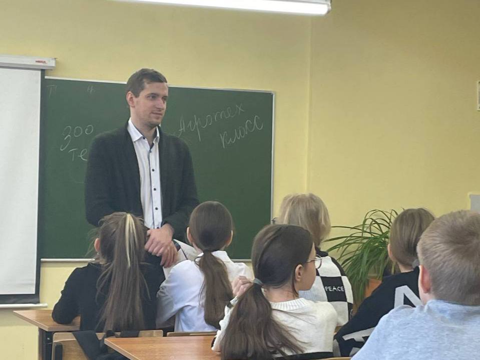 В рамках профориентационной встречи заместитель начальника отдела довузовской подготовки и профориентации Максим Лебедев рассказал о правилах приёма в университет и познакомил школьников с историей нашего вуза.